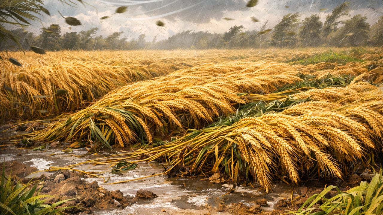 - फसल गिरना (Lodging): खेत में खड़ी फसल हवा के झोंकों से झुक या गिर सकती है.