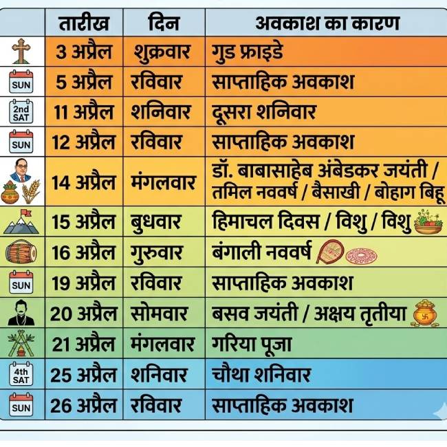 गुड फ्राइडे के बाद 5 अप्रैल को रविवार है. फिर 11 और 12 अप्रैल को दूसरा शनिवार और रविवार आएगा. 14 अप्रैल को अंबेडकर जयंती और बैसाखी जैसे बड़े त्योहार हैं, जबकि 15 और 16 अप्रैल को भी अलग-अलग राज्यों में त्योहारों के कारण बैंक बंद रहेंगे. इसके बाद 19 अप्रैल को रविवार, 20 अप्रैल को अक्षय तृतीया, 21 अप्रैल को गरिया पूजा, 25 अप्रैल को चौथा शनिवार और 26 अप्रैल को फिर रविवार रहेगा.