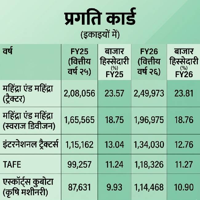 इस क्षेत्र में कंपनियों के बीच भी कड़ी प्रतिस्पर्धा देखने को मिली. महिंद्रा एंड महिंद्रा ट्रैक्टर सेगमेंट में सबसे आगे रही, जिसकी बाजार हिस्सेदारी 23.81 प्रतिशत रही. इसके बाद स्वराज डिवीजन दूसरे स्थान पर रहा, जिसकी हिस्सेदारी 18.76 प्रतिशत रही.