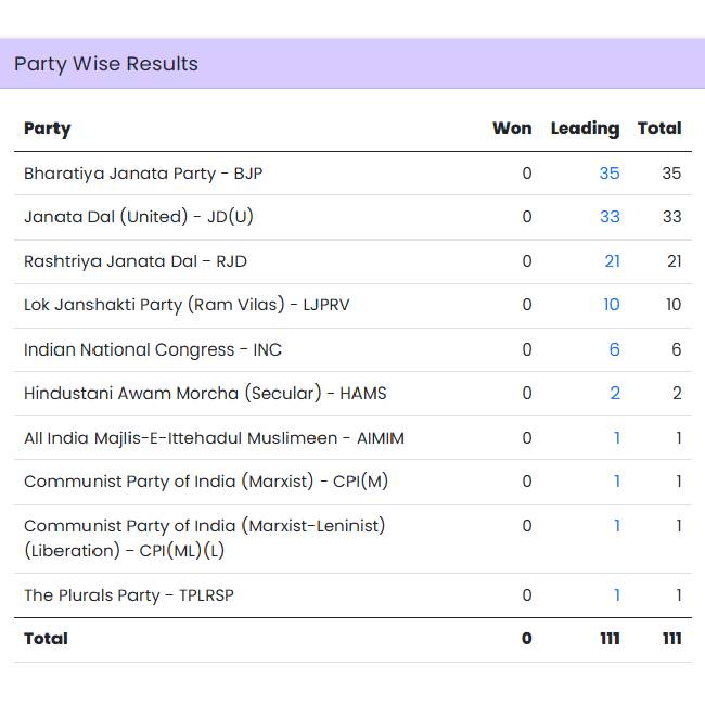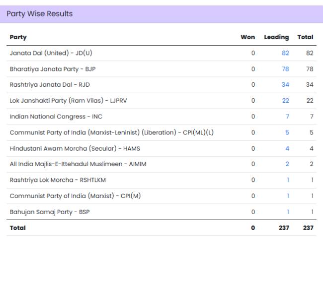 Bihar Election Results live updates in Hindi : बिहार विधानसभा चुनाव 2025 की मतगणना (Bihar Election Counting) आज सुबह 8 बजे से शुरू हो गई है. बिहार में 243 सीटों के लिए वोटों की गिनती 46 केंद्रों पर कड़ी सुरक्षा में होगी. ईवीएम (EVM Seal) और वीवीपैट सील हैं और मतगणना की निगरानी चुनाव पर्यवेक्षक करेंगे. आज एनडीए गठबंधन (NDA Alliance) की ओर से सीएम नीतीश कुमार (CM Nitish Kumar) , कृषि मंत्री विजय सिन्हा (Agriculture Minister Vijay Sinha) , जीतन राम मांझी (jitan ram manjhi party), इंडिया महागठबंधन (INDIA Block) की ओर से तेजस्वी यादव (Tejaswi Yadav Vote), खेसारी यादव (khesari lal yadav mla seat) के साथ ही तेज प्रताप यादव (tej pratap yadav constituency result live), प्रशांत किशोर (Prashant Kishore Party News) की पार्टी जनसुराज (Jan Suraj Bihar Election Performance), असदुद्दीन ओवैसी (Asaduddin Owaisi), उपेंद्र कुशवाहा (Upendra Kushawaha) समेत कई बड़े नेताओं के उम्मीदवारों का रिजल्ट का खुलासा हो रहा है. एग्जिट पोल में एनडीए (Edit Polls Results Reverse) को बहुत का अनुमान जताया गया है. Bihar Election Winners List, Bihar Chunav Lost Candidates List, Bihar chunav men kaun jeeta kaun hara list