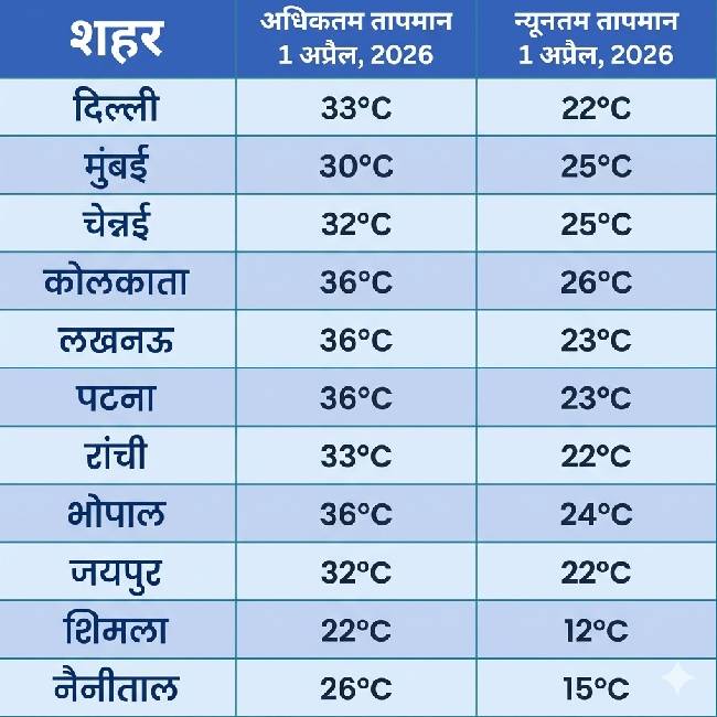 मौसम विभाग के अनुसार आने वाले दिनों में देश के कई हिस्सों में तेज हवाओं के साथ बारिश और बिजली गिरने की घटनाएं बढ़ सकती हैं. खासकर 1 अप्रैल को दिल्ली और आसपास के इलाकों में तेज आंधी और बारिश की संभावना जताई गई है, जहां हवाएं करीब 60 किलोमीटर प्रति घंटे की रफ्तार से चल सकती हैं.