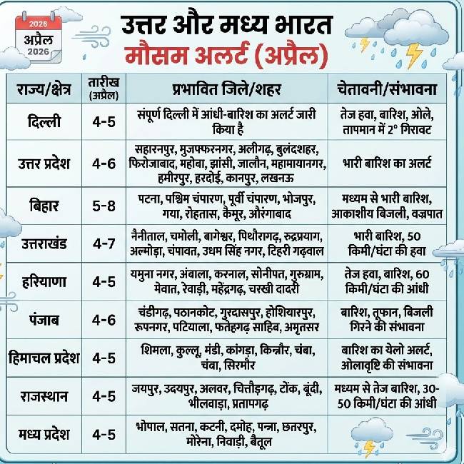 मौसम विभाग का कहना है कि इस सप्ताह उत्तर-पश्चिम भारत में दो पश्चिमी विक्षोभ सक्रिय रहेंगे. इनका असर खासतौर 4 अप्रैल और 7 अप्रैल को ज्यादा देखने को मिलेगा. इस दौरान कश्मीर घाटी में भारी बारिश की संभावना है, जबकि मध्य और दक्षिण भारत के कई हिस्सों में गरज-चमक के साथ बारिश हो सकती है. कुछ इलाकों में ओलावृष्टि की भी चेतावनी दी गई है.