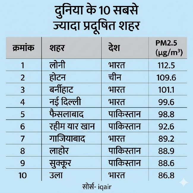 रिपोर्ट के अनुसार दुनिया के 10 सबसे प्रदूषित शहरों में भारत के 5 शहर शामिल हैं. इनमें लोनी, गाजियाबाद, असम का बर्नीहाट, नई दिल्ली और पश्चिम बंगाल का उला शामिल हैं. यह साफ दिखाता है कि देश के कई बड़े शहरों में प्रदूषण लगातार बढ़ रहा है.