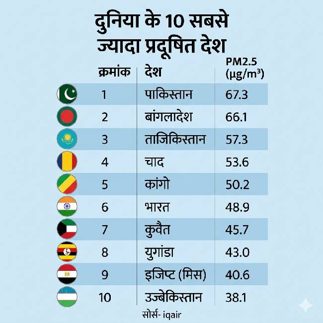 सबसे प्रदूषित देशों की सूची में पाकिस्तान पहले नंबर पर है. इसके बाद बांग्लादेश, ताजिकिस्तान, चाड और कांगो का नाम आता है. भारत इस सूची में छठे स्थान पर है, जो बताता है कि यहां भी प्रदूषण एक बड़ी समस्या बन चुका है.